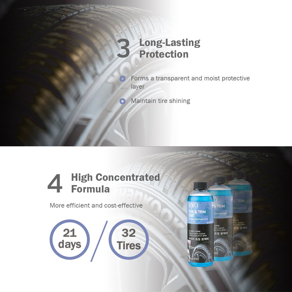 Dung Dịch Phủ Bảo Vệ Lốp & Viền Nhựa: Hiệu quả kéo dài 21 ngày, sử dụng được cho 32 lốp xe. Nhanh chóng tạo lớp phủ bảo vệ trên lốp và lớp bảo vệ giữ ẩm.
