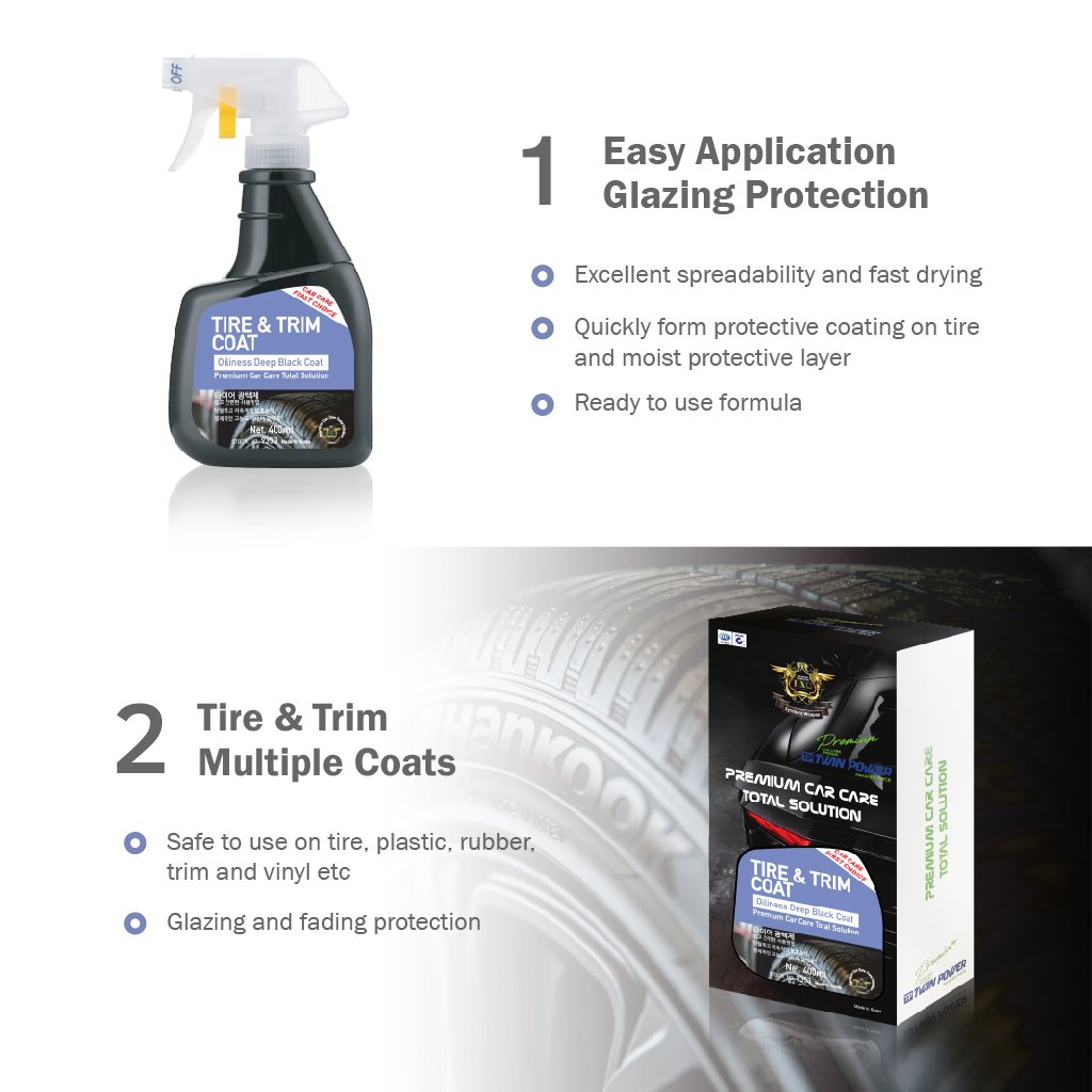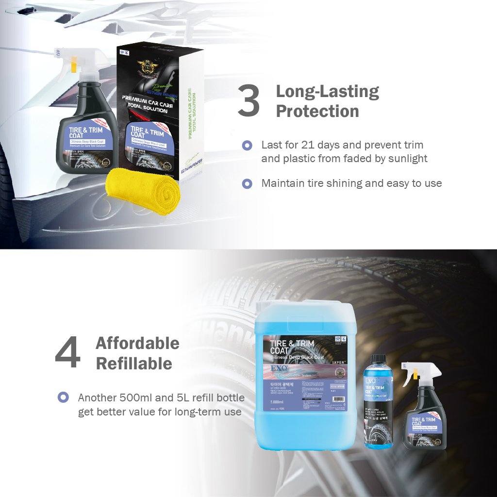Hiệu quả kéo dài 21 ngày,ngăn chặn viền xe cùng nhựa bị phai màu do ánh nắng mặt trời. Nhanh chóng tạo lớp phủ bảo vệ trên lốp xe và lớp giữ ẩm. An toàn khi sử dụng trên lốp, nhựa, cao su, viền xe, vinyl, v.v.