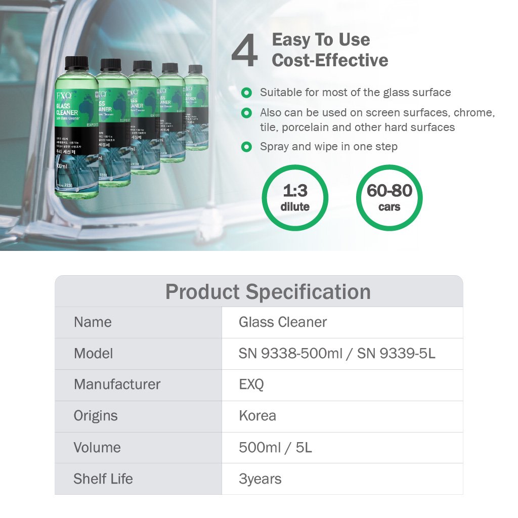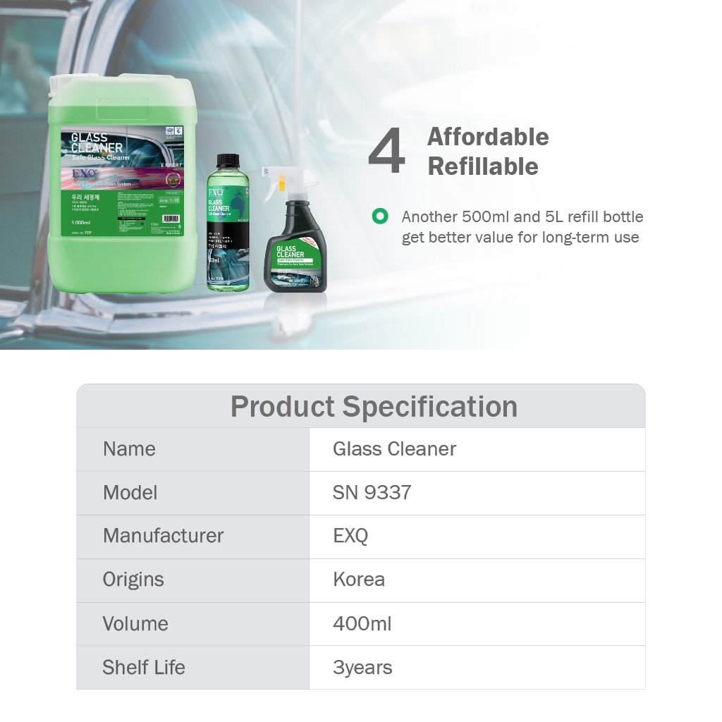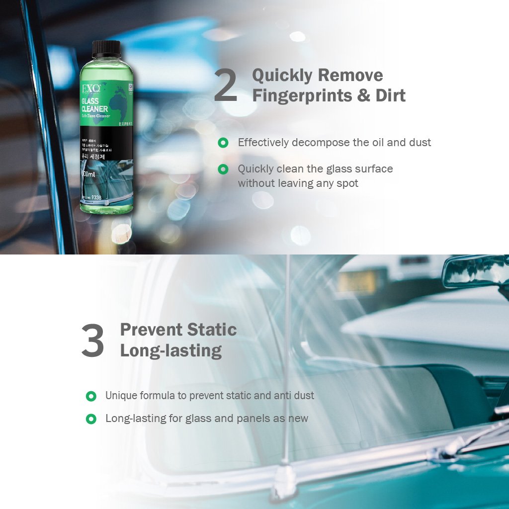 Glass Cleaner Expert: Loại bỏ bụi bẩn đường phố, vết bẩn và côn trùng, để lại bề mặt kính trong suốt, không vệt. Dễ dàng loại bỏ hơi mờ do vinyl và màng khói thuốc lá bám trên kính.