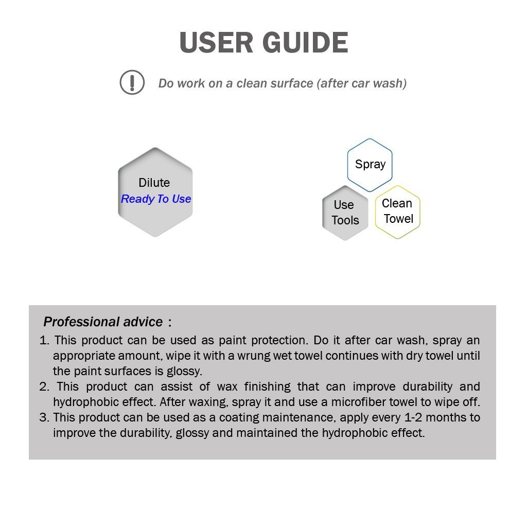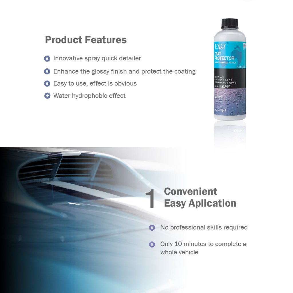 Dung dịch xịt làm sạch nhanh tiên tiến. Chỉ mất 10 phút để hoàn thiện toàn bộ xe. Tăng cường độ bóng. Hiệu ứng kỵ nước giúp chống bám bẩn và tự làm sạch.