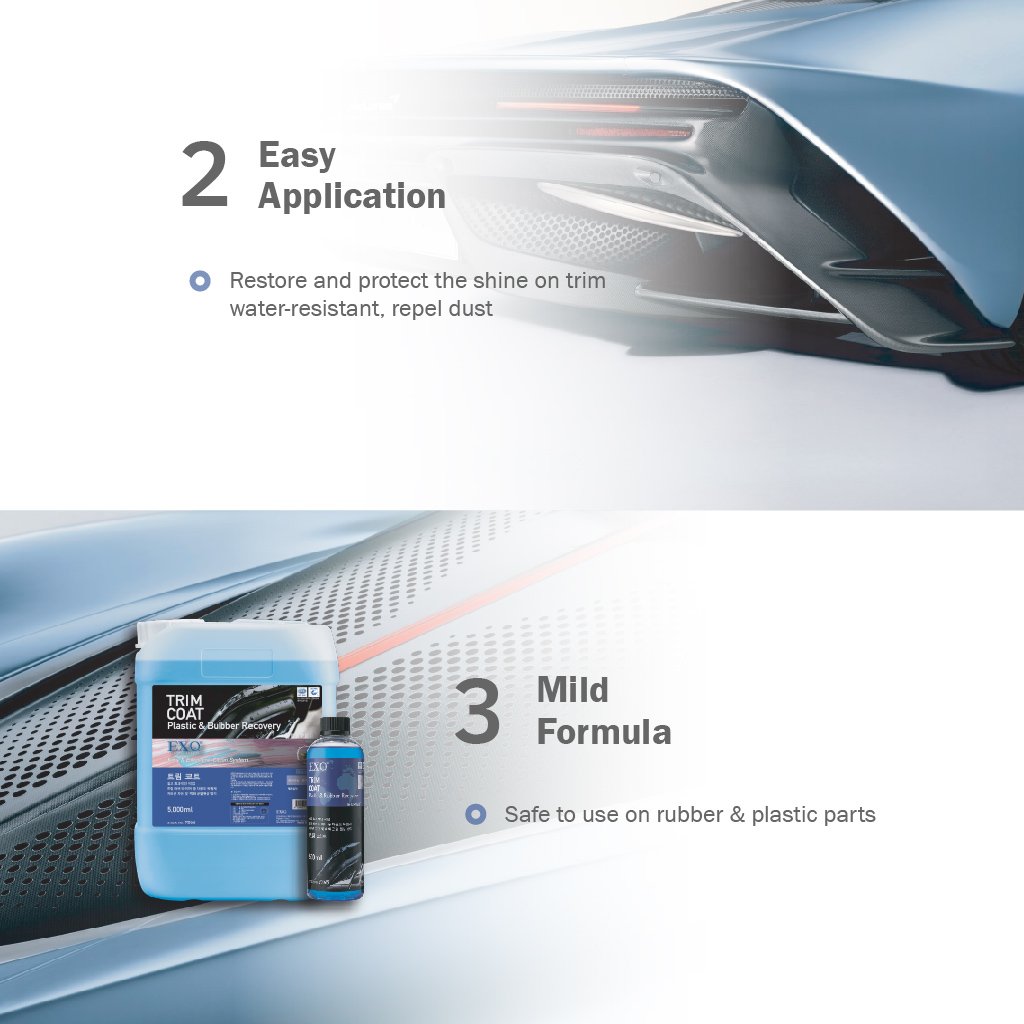 Công thức dịu nhẹ, an toàn hơn. An toàn khi sử dụng trên các bộ phận cao su và nhựa. Dễ dàng và nhanh chóng phục hồi cao su, nhựa, viền bị phai màu. Khôi phục và bảo vệ độ bóng, chống nước, chống bám bụi.