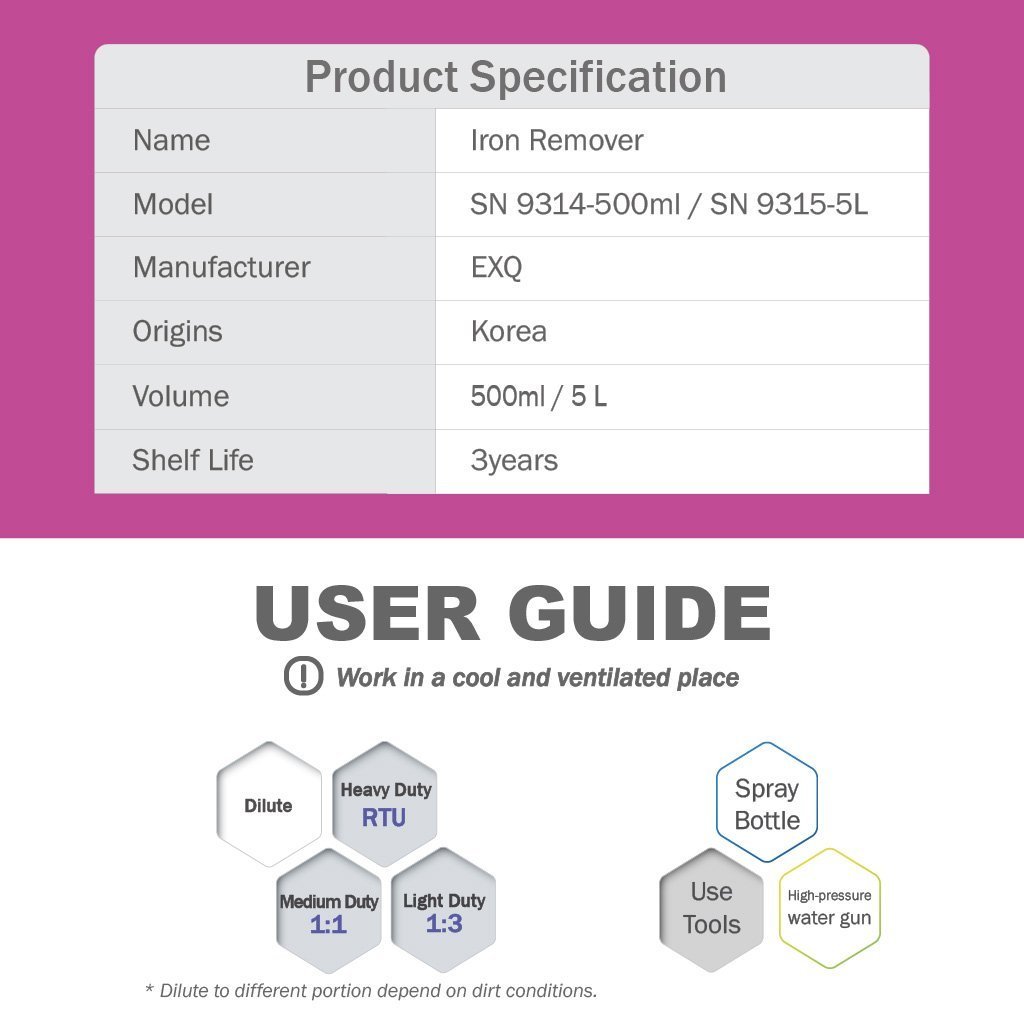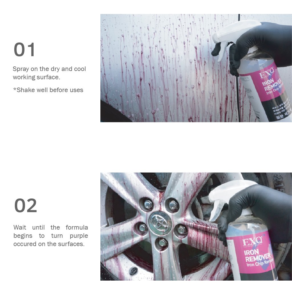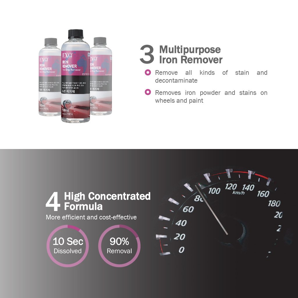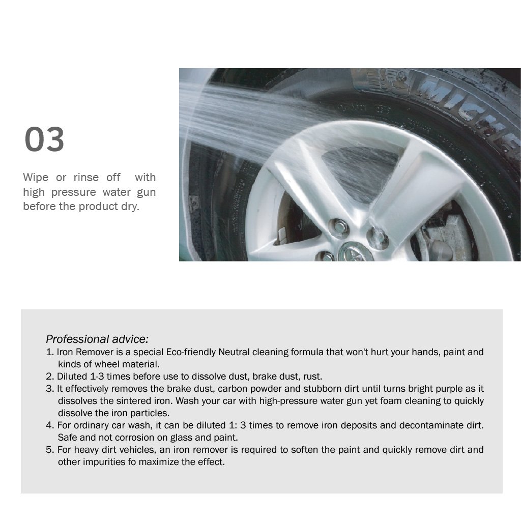 Quá trình thanh lọc sắt nhanh chóng. Hoà tan các loại sắt sâu trên bề mặt sơn. Tính trung bình, không chứa môi trường. An toàn cho mọi bề mặt, bao gồm cả mâm xe.