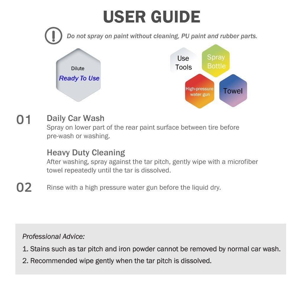Không cần pha loãng. Công thức dịu nhẹ, an toàn cho bề mặt sơn xe. Phân hủy nhanh. Chỉ cần xịt trực tiếp và rửa sạch hoàn toàn mà không để lại vết. Loại bỏ an toàn dầu mỡ, nhựa đường, nhựa cây, côn trùng và keo dính.